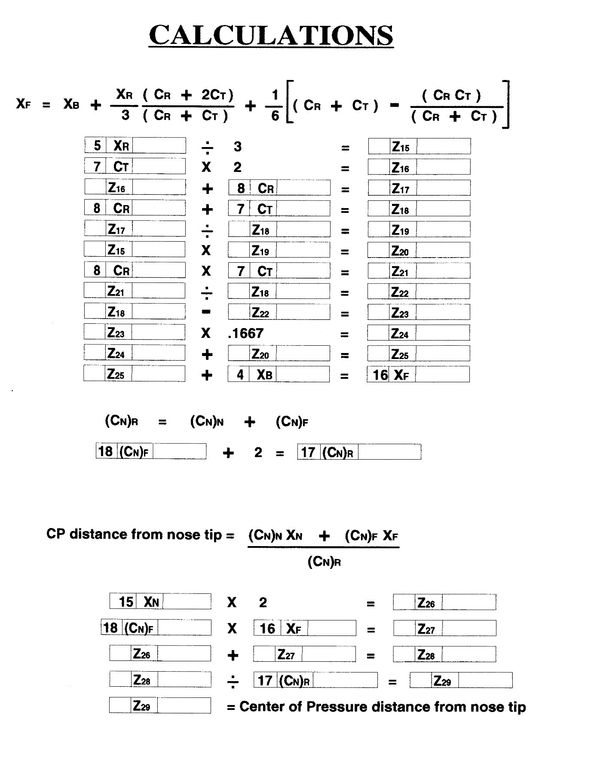 OK, continuing to the second page of the calculations. Start at the top of the page and fill in the boxes top to bottom just like the previous page. Work your way down to the final value, "16" "XF", partial CP of the fins.