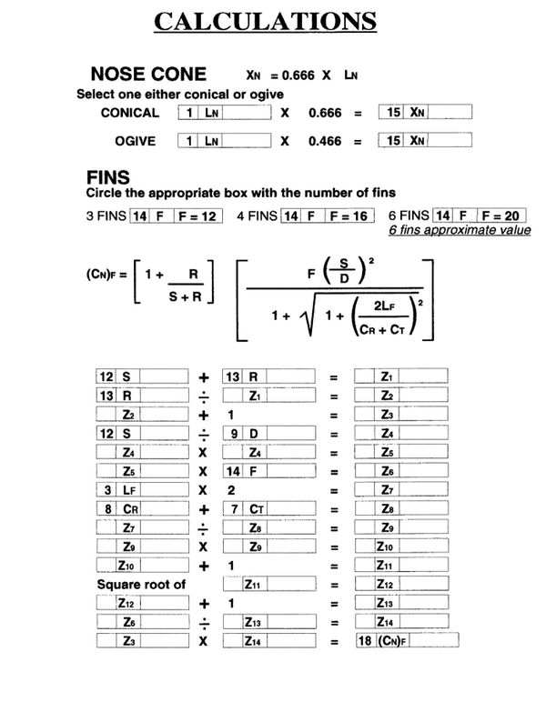 COEFFICIENT OF FORCE FOR FINS. The actual formula that we will be solving for the coefficient of force for fins comes next preceding the actual calculations. To solve the calculations, find the values you measured and insert them in the appropriate numbered boxes corresponding to the variable to be used in the equation. For example, the first box is looking for the fin semi-span value from your rocket picture with the measurements. Find the box numbered "12" variable name "S" and write the length into box "12" variable name "S" on the first calculations page. Then find the box "13" on the rocket picture with measurements for "R" radius and write the length value into box "13" variable name "R" on the first line and the second line. Add the value of box "12" variable name "S" to box "13" variable name "R" and write the result into the box with variable name "Z1", this is an intermediate variable. Also write this resulting value into the box with variable name "Z1" on the second line. Then on the second line, divide box "13" variable name "R" by the intermediate variable result from the first line "Z1" and write the result into the right most box with the intermediate variable name "Z2". Keep working down the page filling in the variables as you go until you get the final result in box "18" variable name "(CN)F", which is the coefficient of force for fins.